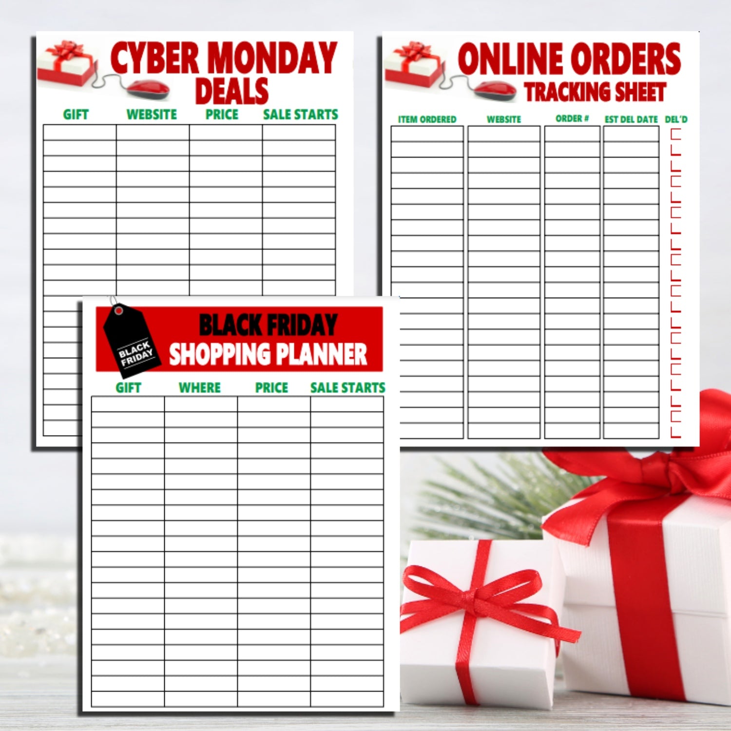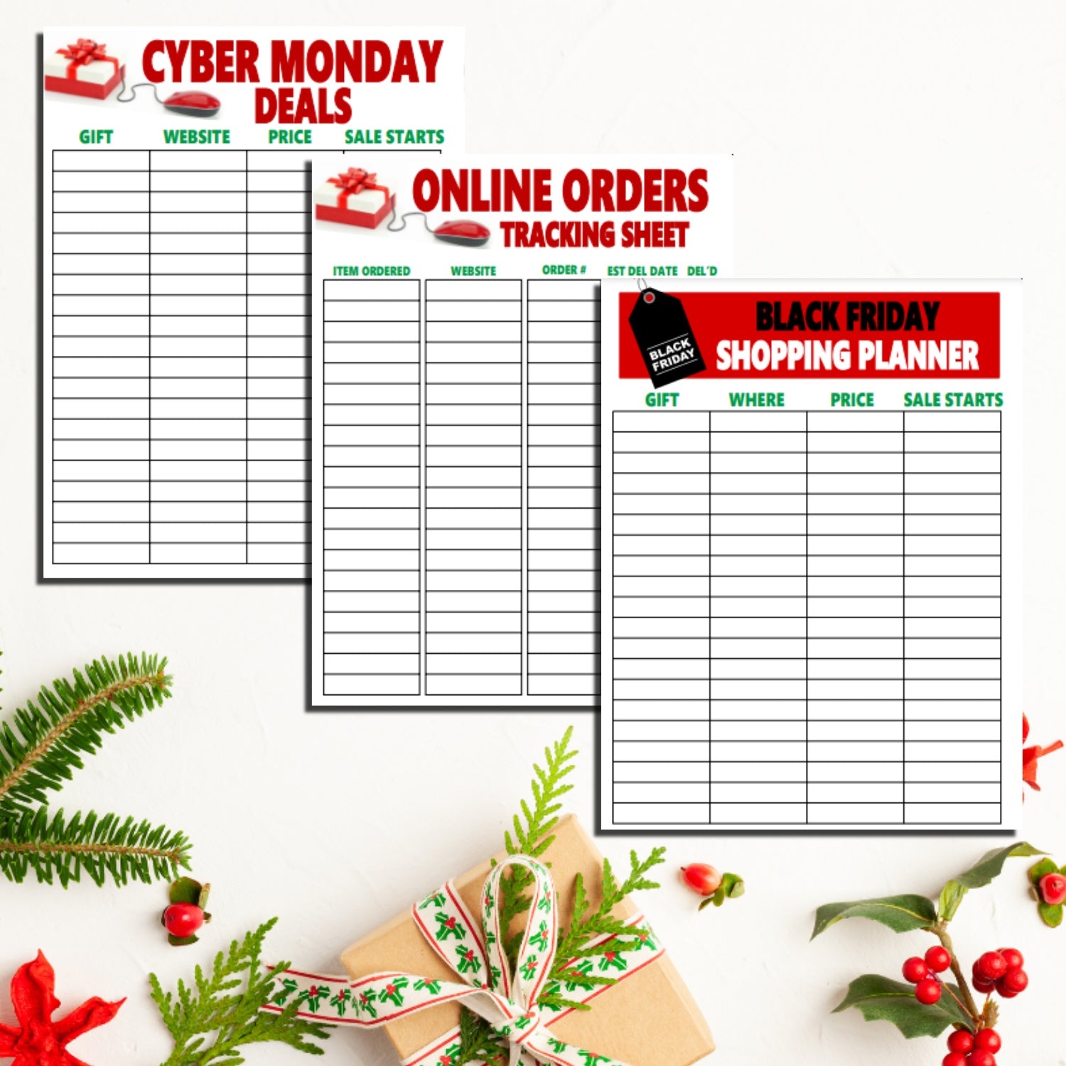 You'll get two shopping tracking sheets, one for Black Friday shopping and another for Cyber Monday shopping to stay on top of your holiday budget and never miss a good deal.