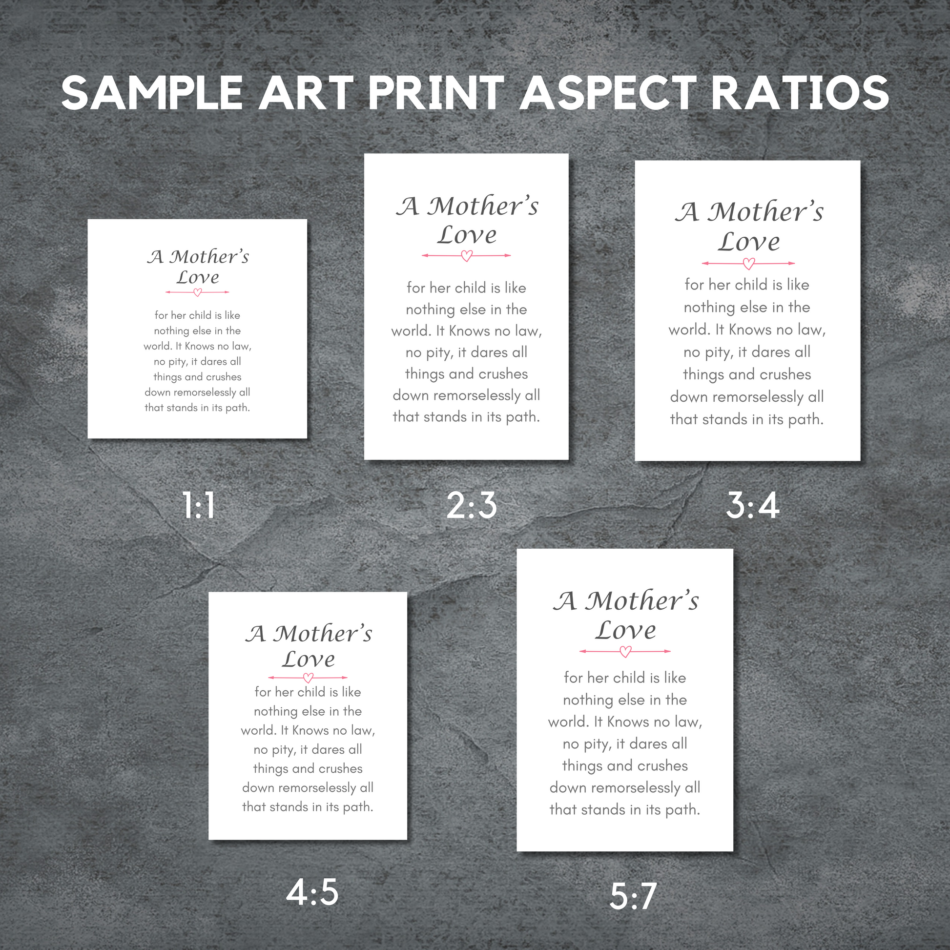 You will receive digital files in both JPG and PNG format in 5 print ratios for unlimited size options to choose from including...