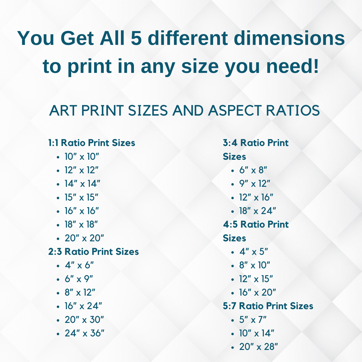 You will receive digital files in both JPG and PNG format in 5 print ratios for unlimited size options to choose from including...