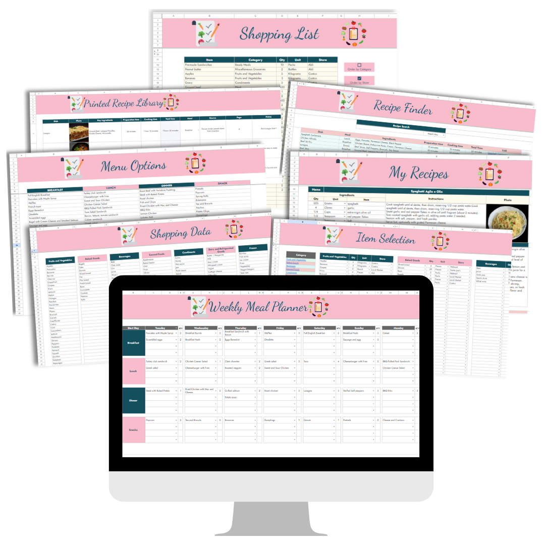 Imagine having a dedicated weekly meal planner, a comprehensive menu planner, a customizable item selection tool, a dynamic shopping list, and a versatile recipe finder - all in one convenient spreadsheet.