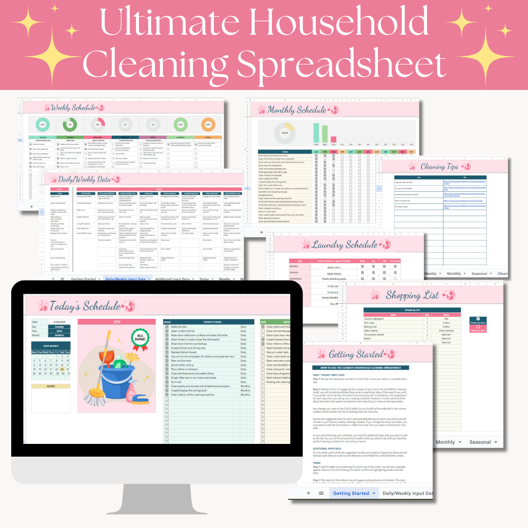 But that's not all! The Pantry Inventory Tracker Spreadsheet keeps your kitchen stocked and organized, while the Ultimate Household Cleaning Spreadsheet ensures your home stays spotless.